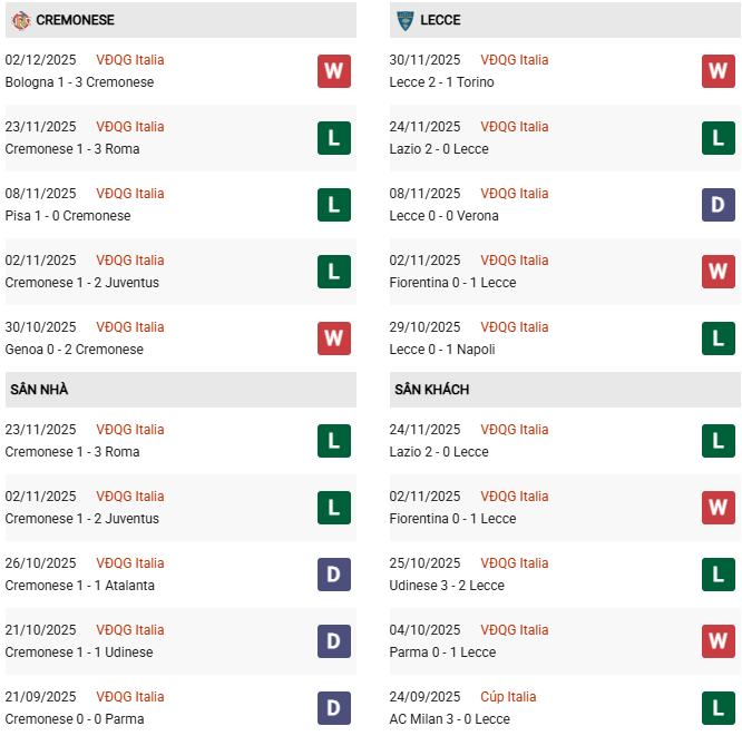 - Trên sân nhà, Cremonese thắng 2, thua 2 trước Lecce.