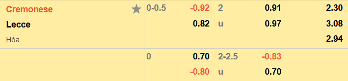 Thông tin tỷ lệ kèo Cremonese vs Lecce:
