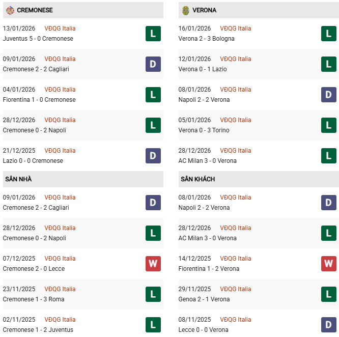 - Trên sân nhà, Cremonese thắng 2, thua 2 trước Verona.