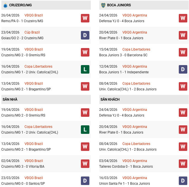 - Trên sân nhà, Cruzeiro thắng 1, thua 1 trước Boca Juniors.
