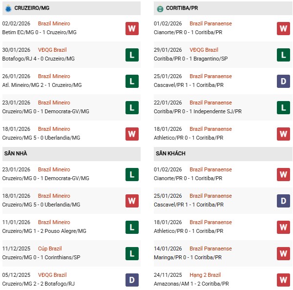 Thống kê phong độ Cruzeiro vs Coritiba:
