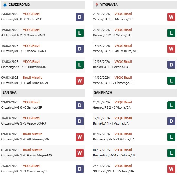 Thống kê phong độ Cruzeiro vs Vitoria: