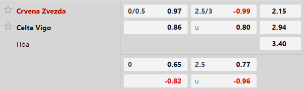 Thông tin tỷ lệ kèo Crvena Zvezda vs Celta Vigo: