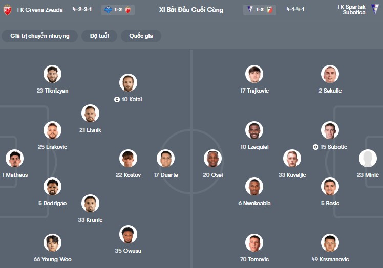 Đội hình dự kiến Crvena Zvezda vs Subotica: