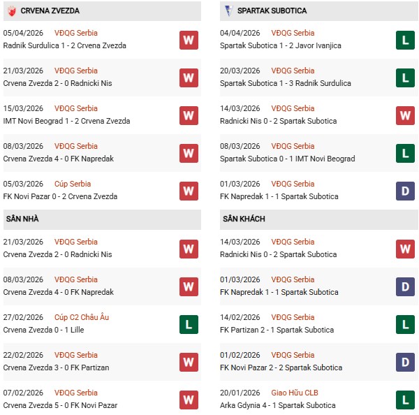 Thống kê phong độ Crvena Zvezda vs Subotica: