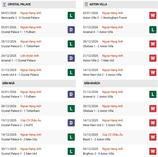 Thống kê phong độ Crystal Palace vs Aston Villa: