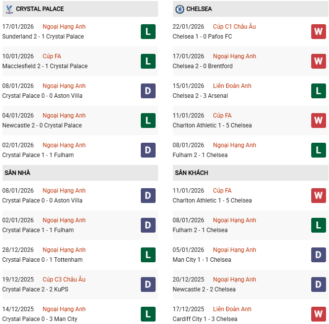Thống kê phong độ Crystal Palace vs Chelsea: