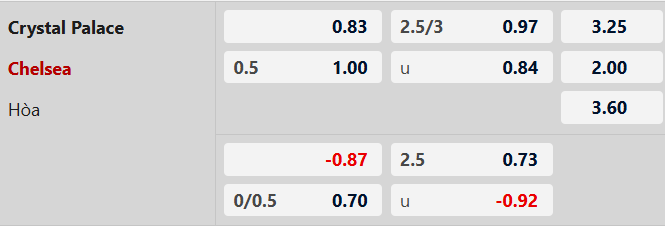 Thông tin tỷ lệ kèo bóng đá Crystal Palace vs Chelsea: