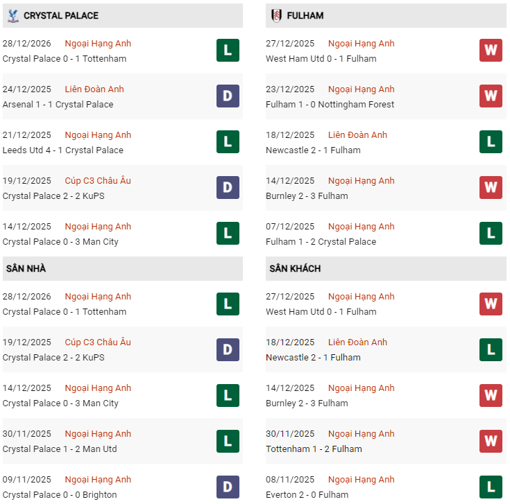 Thống kê phong độ Crystal Palace vs Fulham: