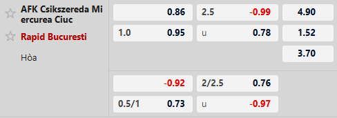 Thông tin tỷ lệ kèo Csikszereda vs Rapid Bucuresti: