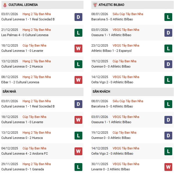Thống kê phong độ Cultural Leonesa vs Bilbao: