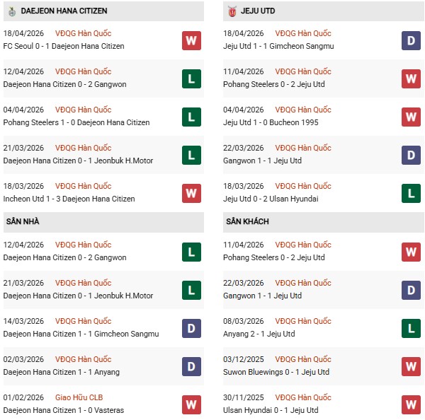 Thống kê phong độ Daejeon Hana vs Jeju SK: