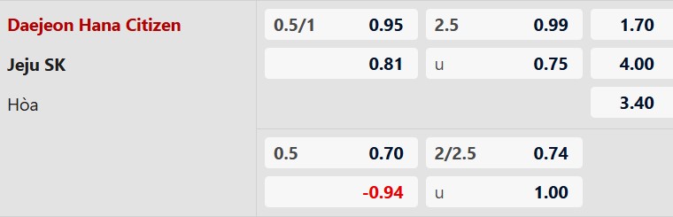 Thông tin tỷ lệ kèo Daejeon Hana vs Jeju SK: