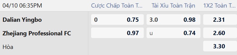 Thông tin tỷ lệ kèo Dalian Yingbo vs Zhejiang: