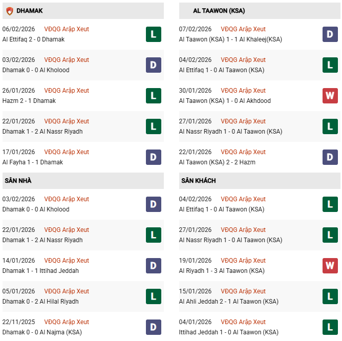 Trên sân nhà, Damac cũng chẳng có niềm vui ở 10 trận vừa xong. Còn với Al Taawon, họ thắng 5/10 trận sân khách gần đây. Về thành tích đối đầu, Al Taawon thắng 2 và hòa 2 trước Damac ở 4 trận đã qua. Nhiều khả năng, Al Taawon sẽ có 3 điểm trước Damac.