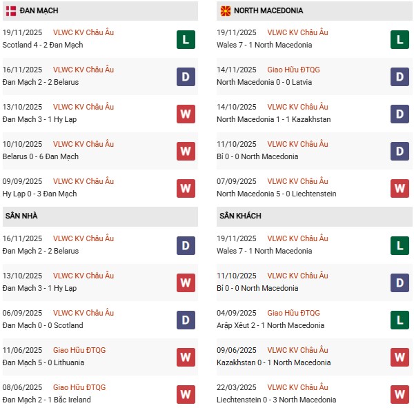 Thống kê phong độ Đan Mạch vs Bắc Macedonia: