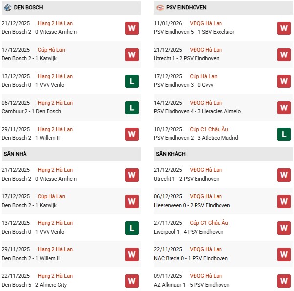 Trên sân nhà, Den Bosch cũng cho thấy sự tự tin nhất định khi thắng 6, hòa 2 và chỉ thua 2 trong 10 trận gần đây. Việc thường xuyên chơi chủ động trước các đối thủ cùng hạng giúp Den Bosch tạo ra thế trận khá tốt khi có lợi thế sân bãi. Tuy nhiên, khi đối đầu với một ông lớn như PSV Eindhoven, sự chênh lệch về đẳng cấp, chiều sâu đội hình và kinh nghiệm ở những trận cầu lớn là rất rõ ràng.