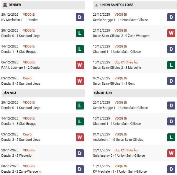 - Trên sân nhà, Dender thắng 1, thua 2 trước Saint-Gilloise.