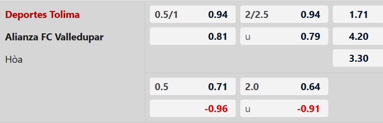 Thông tin tỷ lệ Deportes Tolima vs Alianza: