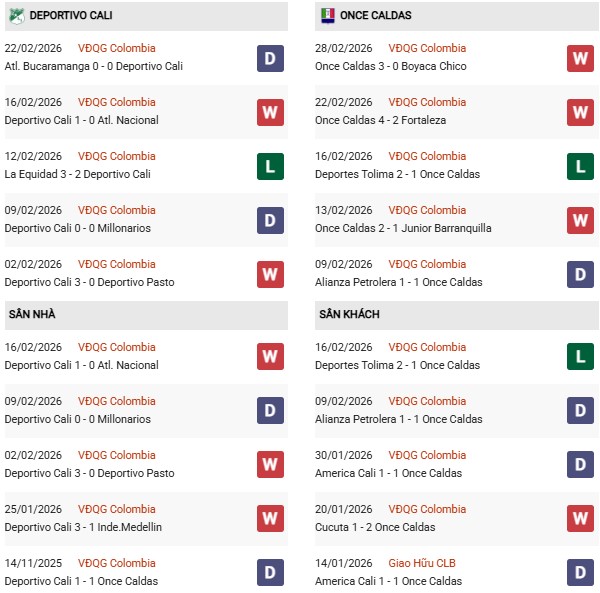 Ngoài ra trước trận thua trên sân của Tolima vào ngày 16/2 vừa rồi, Once Caldas từng trải qua 5 chuyến hành quân liên tiếp bất bại. Trong số này có trận hòa 1-1 trên sân của chính Deportivo Cali.