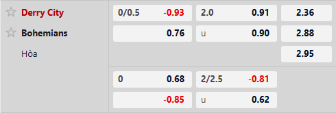 Thông tin tỷ lệ bóng đá Derry City vs Bohemians: