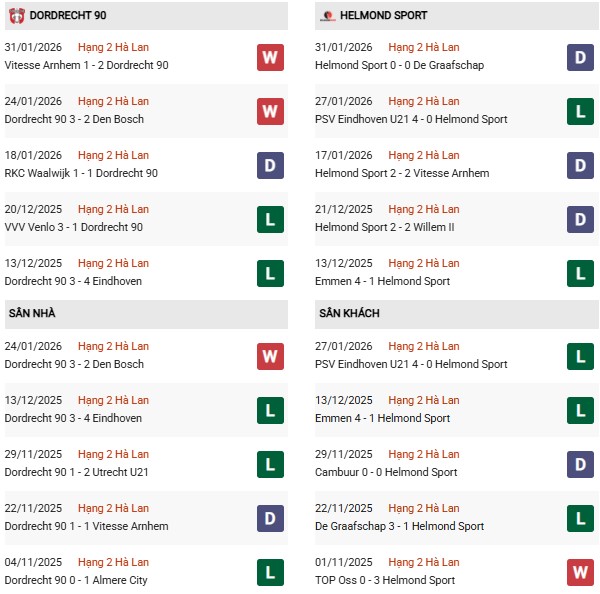 Tuy nhiên, phong độ gần đây của Dordrecht chưa thật sự thuyết phục khi chỉ thắng 3, hòa 3 và thua 4 trong 10 trận gần nhất trên mọi đấu trường. Trên sân nhà, họ thậm chí còn chơi thiếu ổn định hơn với 2 chiến thắng, 3 trận hòa và 5 thất bại trong 10 lần tiếp khách gần đây. Dù vậy, trước một Helmond Sport đang sa sút mạnh, Dordrecht vẫn có cơ hội lớn để hướng tới 3 điểm trọn vẹn.