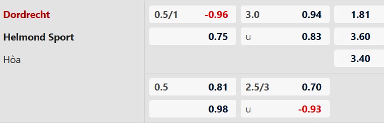 Dordrecht chấp 3/4 bàn trận này, cho thấy đội chủ nhà được đánh giá cao hơn đáng kể ở cặp đấu này. Dù phong độ sân nhà không quá ấn tượng, Dordrecht vẫn vượt trội so với Helmond Sport nhờ sự ổn định tương đối và lợi thế sân bãi. Trong bối cảnh đội khách thi đấu rất kém trên sân đối phương, Dordrecht là lựa chọn đáng tin cậy hơn ở kèo chấp này.
