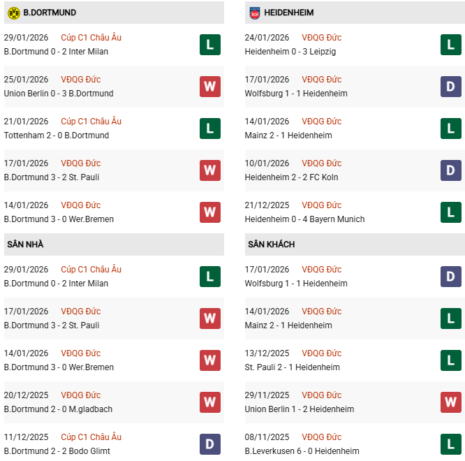 - Trên sân nhà, Dortmund thắng 1, hòa 1 trước Heidenheim.