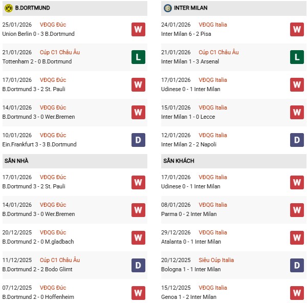 Thống kê phong độ Dortmund vs Inter Milan: