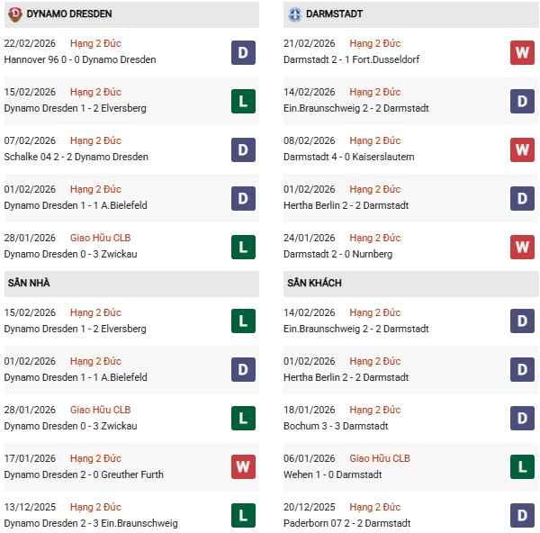 - Trên sân nhà, Dynamo Dresden thắng 2, thua 4 trước Darmstadt.