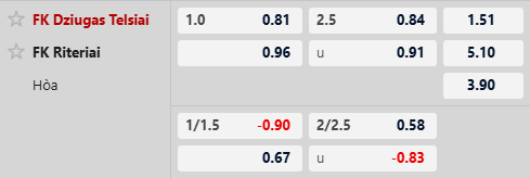 Dziugas Telsiai bất bại kèo cả 6 trận đấu vừa rồi chạm mặt Riteriai có cược chấp châu Á. Dziugas Telsiai thắng kèo 3 trong số 4 trận đấu mới đây. Trong khi đó, Riteriai để thua kèo tới 8 trong số 9 trận đấu vừa qua có tỷ lệ cược.