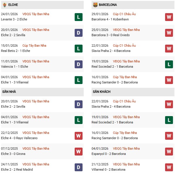 Thống kê phong độ Elche vs Barcelona: