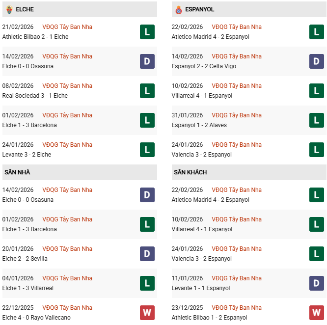 - Elche thắng 2, hòa 4, thua 4 trong 10 trận gặp Espanyol gần đây.