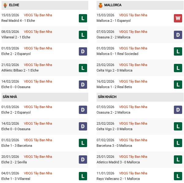 - Elche thắng 2, hòa 5, thua 3 trong 10 trận gặp Mallorca gần đây.