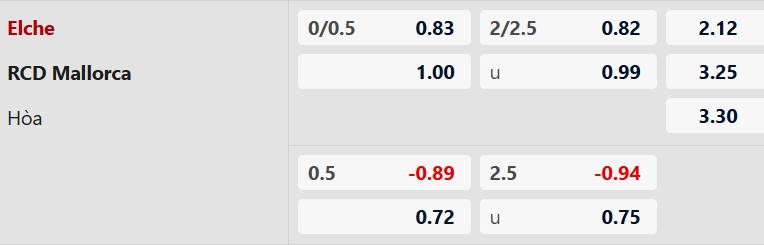 Thông tin tỷ lệ kèo Elche vs Mallorca: