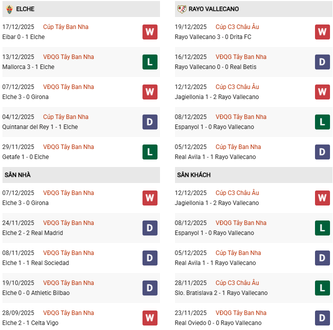 Thống kê phong độ Elche vs Rayo Vallecano: