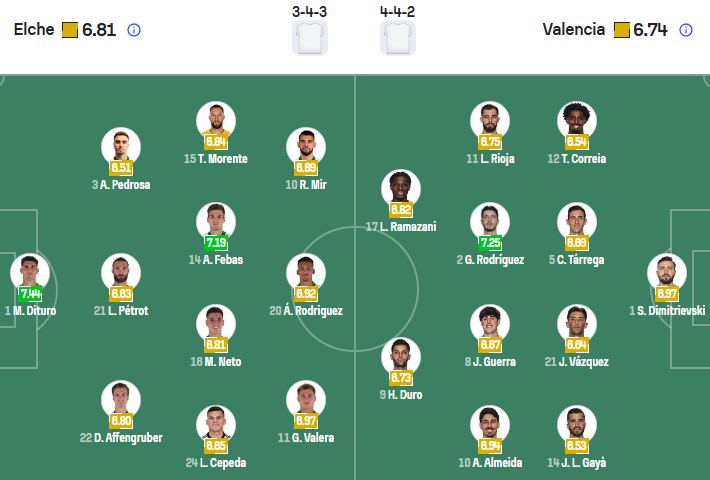 Ở phía đối diện, Valencia đang xếp thứ 14 với 35 điểm và tạo ra khoảng cách 6 điểm so với chính Elche. Dưới sự dẫn dắt của Carlos Corberán, Valencia thi đấu khá thất thường khi thắng 3 và thua 2 trong 5 trận gần nhất. Họ có thể tạo ra những chiến thắng ấn tượng như 3-0 trước Alaves hay 2-0 trước Sevilla, nhưng cũng dễ dàng đánh mất sự ổn định với những thất bại trước Celta Vigo hay Real Oviedo.