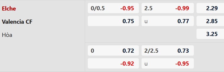 Thông tin tỷ lệ cược Elche vs Valencia: