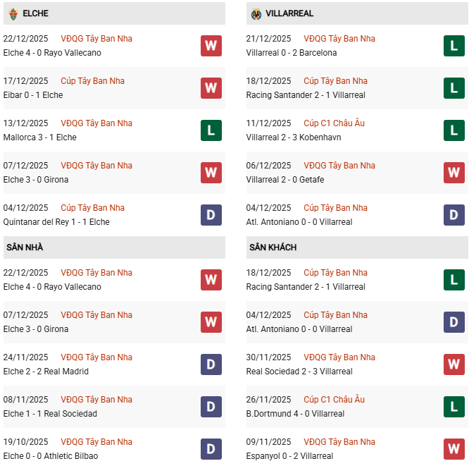 Thống kê phong độ Elche vs Villarreal: