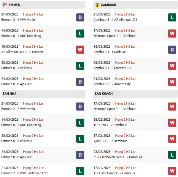 - Emmen thắng 4, hòa 4, thua 2 trong 10 trận gặp Cambuur gần đây.