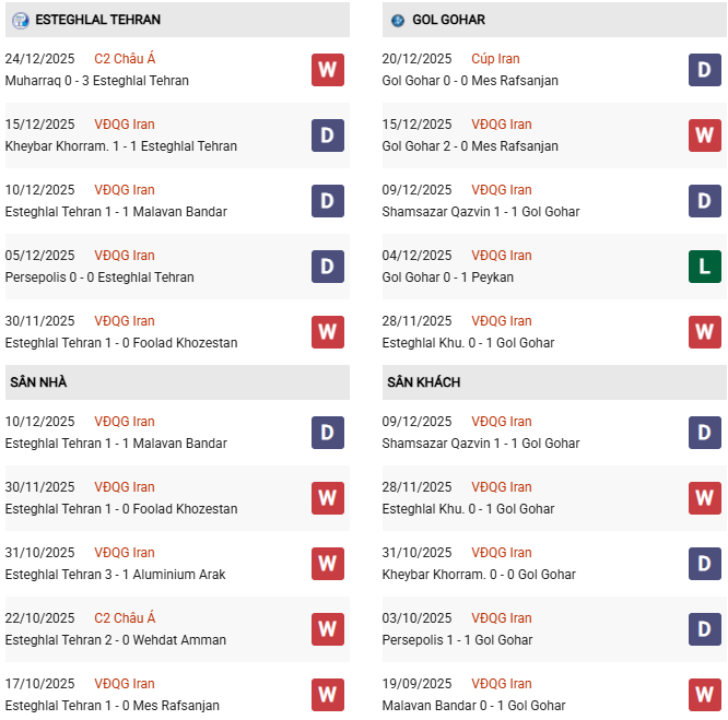 Trong 5 lần chạm trán gần nhất giữa hai đội, Esteghlal bất bại với 2 chiến thắng và 3 trận hòa. Thống kê này cho thấy sự áp đảo về mặt tâm lý cũng như kinh nghiệm thi đấu trước Gol Gohar. Các trận đấu giữa hai đội thường diễn ra với nhịp độ chắc chắn, Esteghlal biết cách kiểm soát trận đấu và khai thác những sơ hở từ đối thủ.