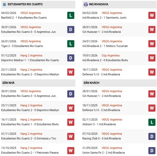 Xét về phong độ tổng thể, thầy trò HLV Iván Delfino có 4 chiến thắng, 3 trận hòa và 3 thất bại trong 10 trận gần nhất. Tuy nhiên, điểm sáng lớn nhất của đội chủ nhà nằm ở thành tích sân nhà. Cụ thể, trong 10 trận sân nhà gần đây, Estudiantes Rio Cuarto thắng 8 và hòa 2, duy trì thành tích bất bại. Đây sẽ là cơ sở để đội bóng này hy vọng có điểm trước Rivadavia.