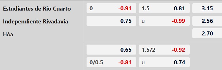 Theo kèo châu Á, hai đội được xếp kèo đồng banh (0:0). Dù Estudiantes Rio Cuarto có lợi thế sân nhà, nhưng sự chênh lệch về phong độ và thứ hạng khiến cán cân đánh giá nghiêng nhiều hơn về phía Rivadavia. Trong khi Estudiantes Rio Cuarto vẫn đang loay hoay tìm chiến thắng đầu tiên, Rivadavia lại duy trì mạch toàn thắng từ đầu mùa. Với tâm lý tự tin cùng chất lượng đội hình nhỉnh hơn, đội khách có nhiều cơ hội giành kết quả tích cực.
