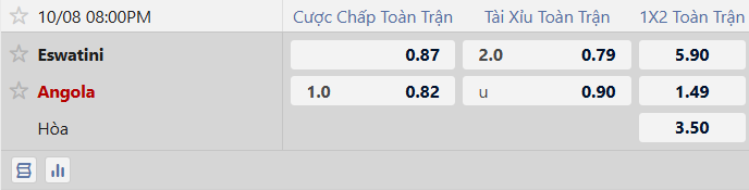 Thông tin tỷ lệ bòng đá Eswatini vs Angola: