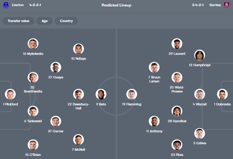 Đội hình dự kiến Everton vs Burnley: