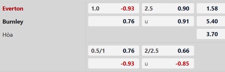 Everton thắng theo châu Á: Everton thắng 4/6 cuộc đối đầu gần nhất, thắng 8/10 cuộc đón tiếp Burnley gần đây. Ngoài ra, Everton cũng không thua ở 6/8 trận vừa qua. Còn Burnley thua 4/6 trận gần đây. Xem ra, trận này khó có ngoại lệ.