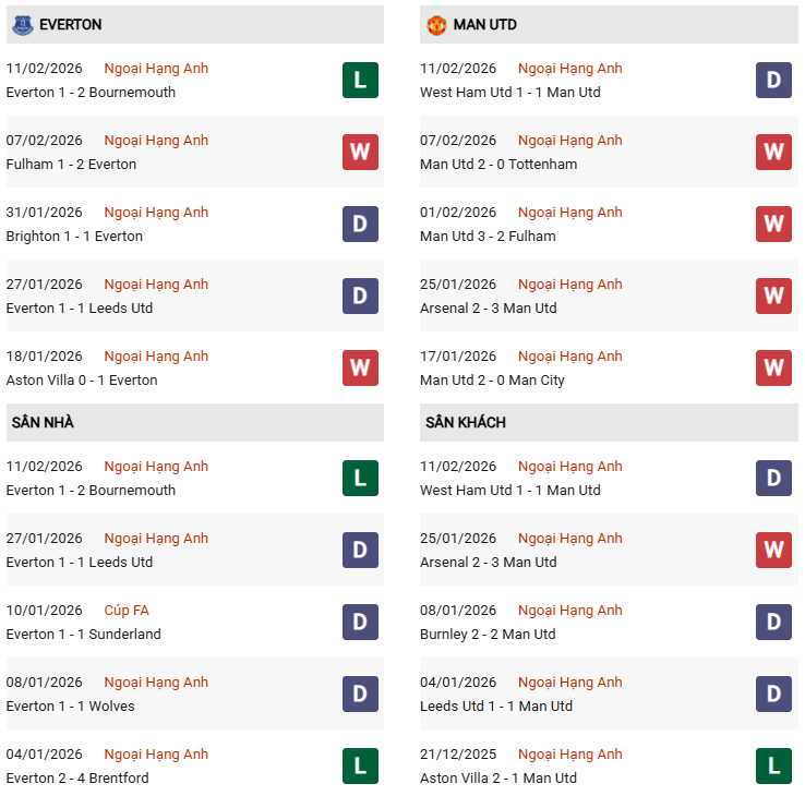 - 5 trận đối đầu vừa qua MU thắng 2 thua 1 và hòa 2 trước Everton.