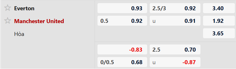 MU thắng theo châu Á: MU chỉ thua theo châu Á có 1/6 trận gần nhất tới sân Everton. Ngoài ra, Everton chỉ thắng theo châu Á có 1/8 trận gần nhất trên sân nhà.