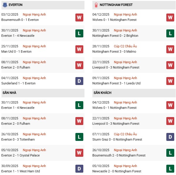 Thống kê phong độ Everton vs Nottingham: