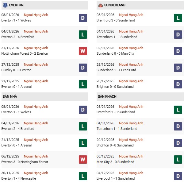 Thống kê phong độ Everton vs Sunderland: